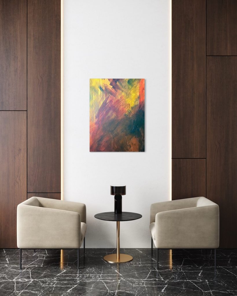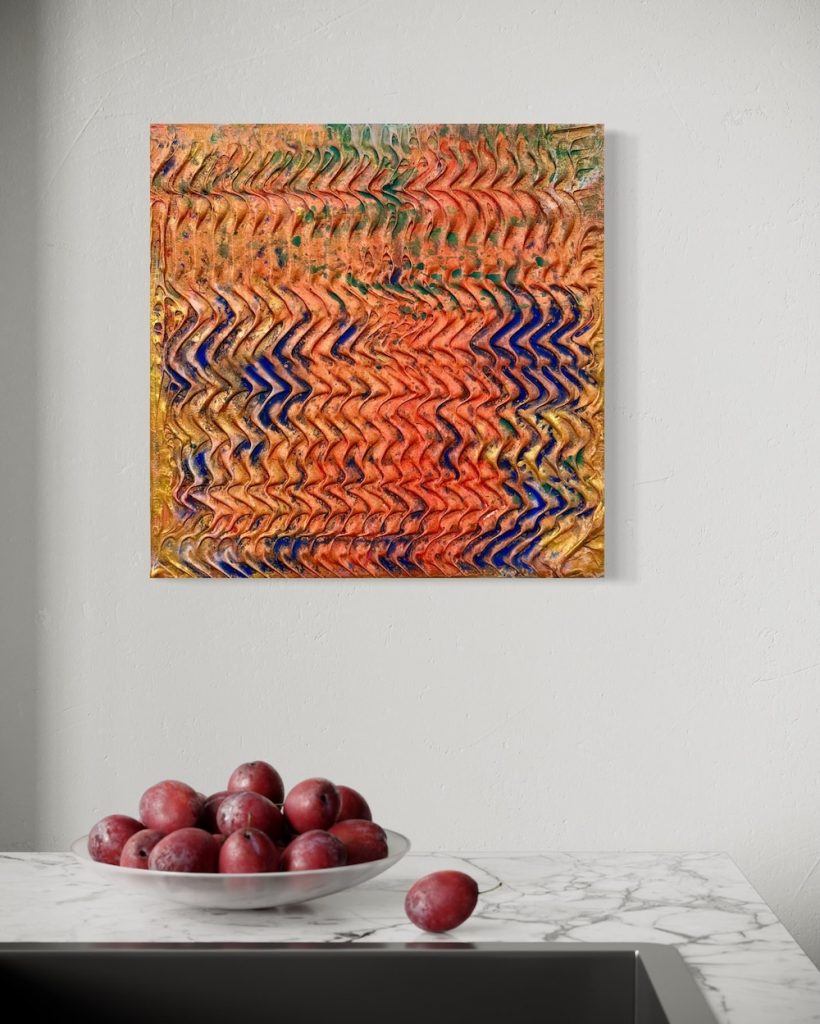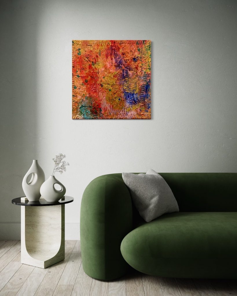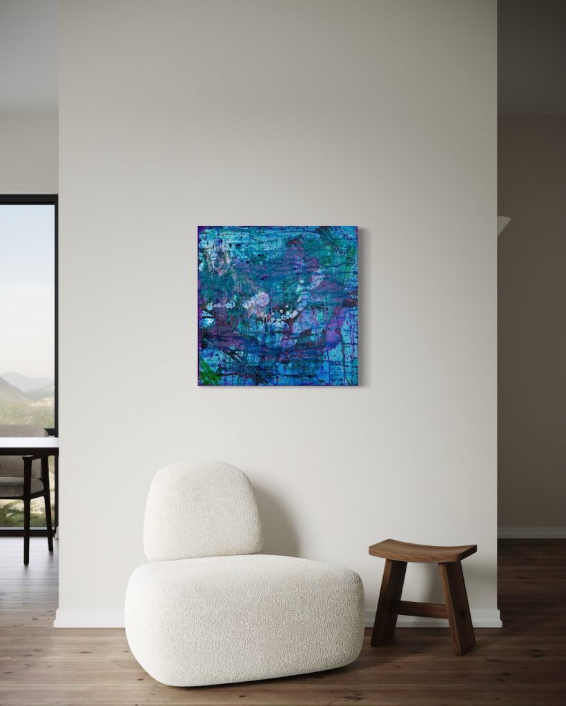 „Musik ist alles. Sie ist mein Klangteppich, mein Einstieg in den Flow. Meist höre ich elektronische Musik – Beats, die mich tragen. Es ist kein „verzaubert-sein“, eher ein völliges Eintauchen in eine Welt, die nichts mehr mit dem Außen zu tun hat. Ich höre die Musik, spüre den Rhythmus, und dann bin ich nur noch in Farbe, Struktur, Bewegung. Wenn ich vor einer großen Leinwand stehe, verschwindet alles – ich sehe nur noch die Farbe, die Verläufe, das Wechselspiel. Ich nehme das auf, lasse es durch mich hindurchfließen und male weiter – in einem Zustand absoluter Offenheit und Klarheit.“
